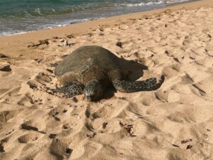 数分後、目の前の波打ち際から海亀が上陸。