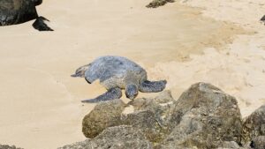 シーズン問わず高確率でウミガメのお昼寝を見学できるビーチ。大人の膝くらいの深さで遠浅なビーチなので、泳げない人でも遊ぶことができます。すぐ隣にはサーフィンの世界大会が開催される「ハレイワビーチ」もあります。